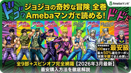 ジョジョの奇妙な冒険(1〜9部+スピンオフ)はAmebaマンガで全巻読める?全シリーズを最安でまとめ買いする方法【2026年3月最新】 『ジョジョの奇妙な冒険』全9部+スピンオフ作品は、Amebaマンガで全巻配信中です。新規登録時の「100冊まで最大50%即時還... -