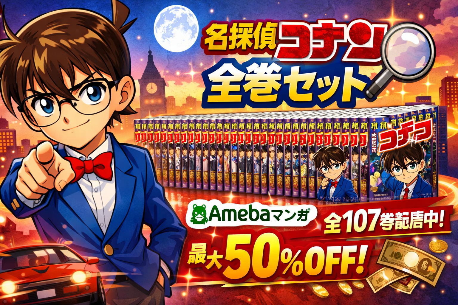 『名探偵コナン』全107巻を一気に揃えたい方へ。Amebaマンガなら全巻配信中で、新規登録時の「100冊まで最大50%即時還元クーポン」を使えば、定価63,558円の全巻セットが実質約31,779円と大幅にお得です。この記事では2026年3月時点の配信状況・最安購入法・読者の口コミまで徹底解説します。