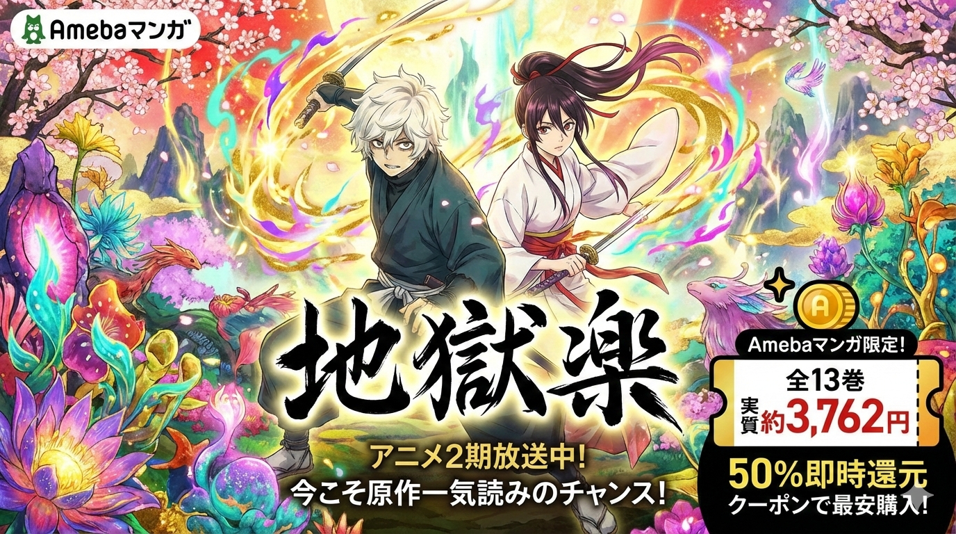 「地獄楽」は全巻無料では読めませんが、Amebaマンガの新規登録特典「100冊まで50%即時還元クーポン」を使えば、全13巻を実質約3,762円で一気読みできます。2026年1月からアニメ2期が放送中の今こそ、原作漫画をお得にまとめ買いする絶好のタイミングです。