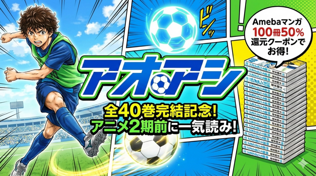 「アオアシ」は2025年8月に全40巻で完結したサッカー漫画の金字塔です。結論から言うと、全巻無料で読む方法はありませんが、Amebaマンガの初回100冊50%即時還元クーポンを使えば全40巻を実質約13,800円で購入できます。2026年のアニメ2期放送を前に、今が... -