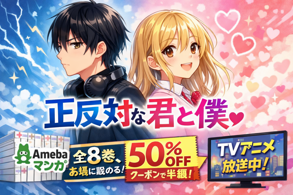 「正反対な君と僕」を全巻お得に読みたい方へ。結論から言うと、Amebaマンガなら全8巻すべて配信中で、新規登録時の100冊50%即時還元クーポンを使えば電子書籍定価約5,478円が実質約2,739円相当で一気読みできます。2026年1月からTVアニメも放送中の今、原... -